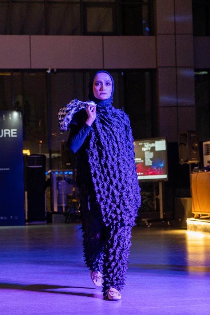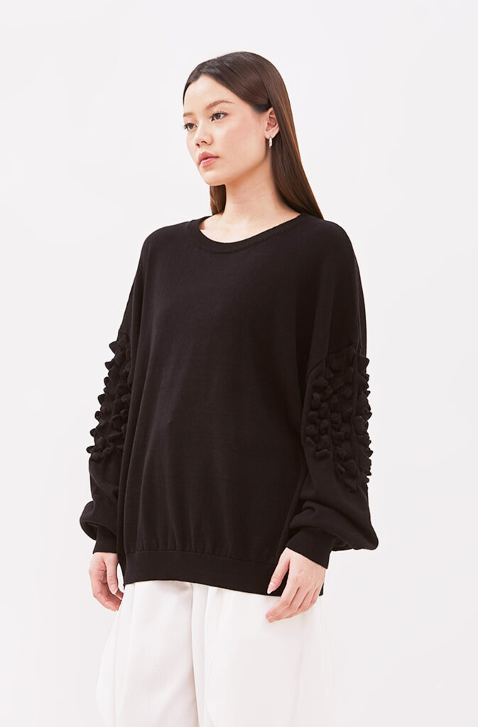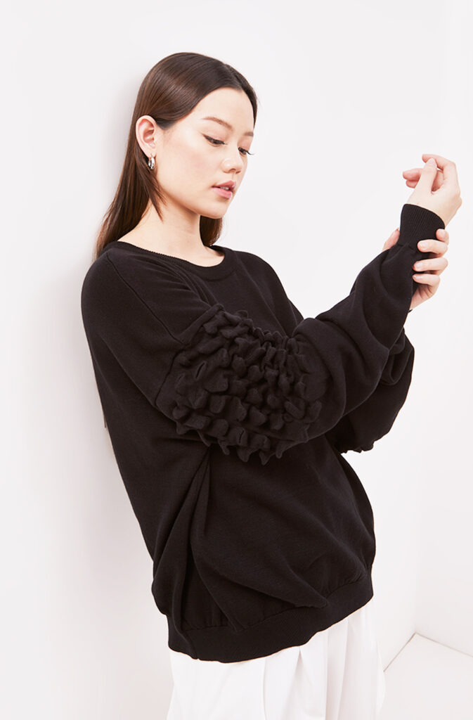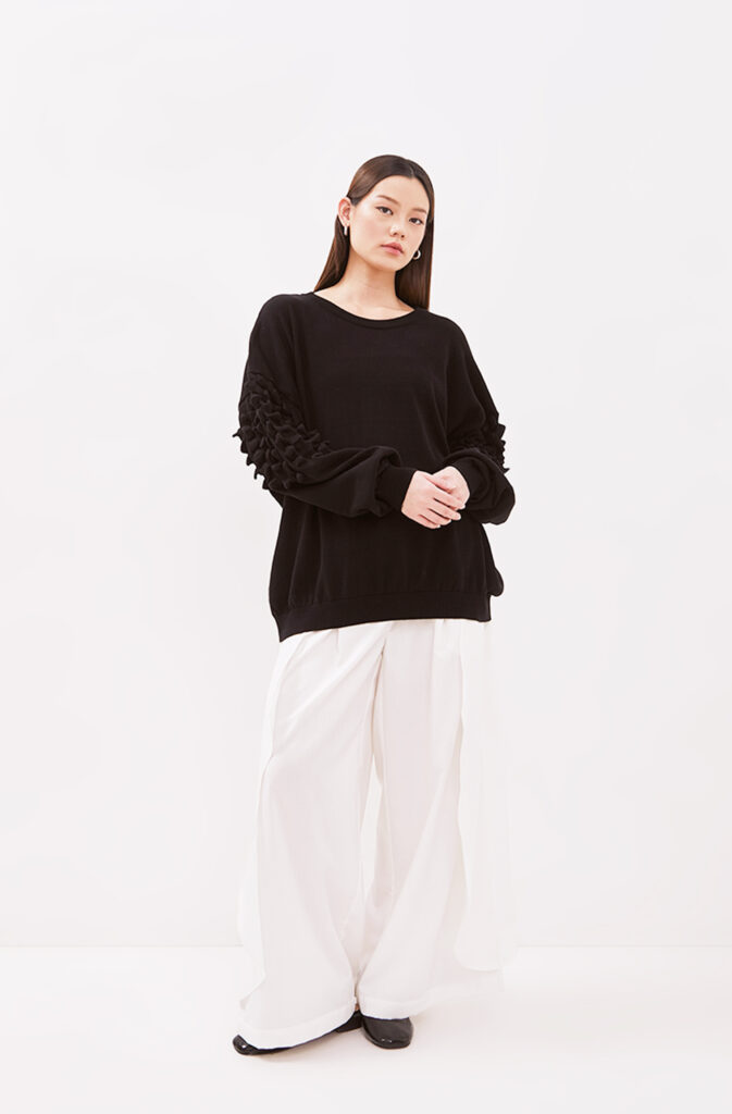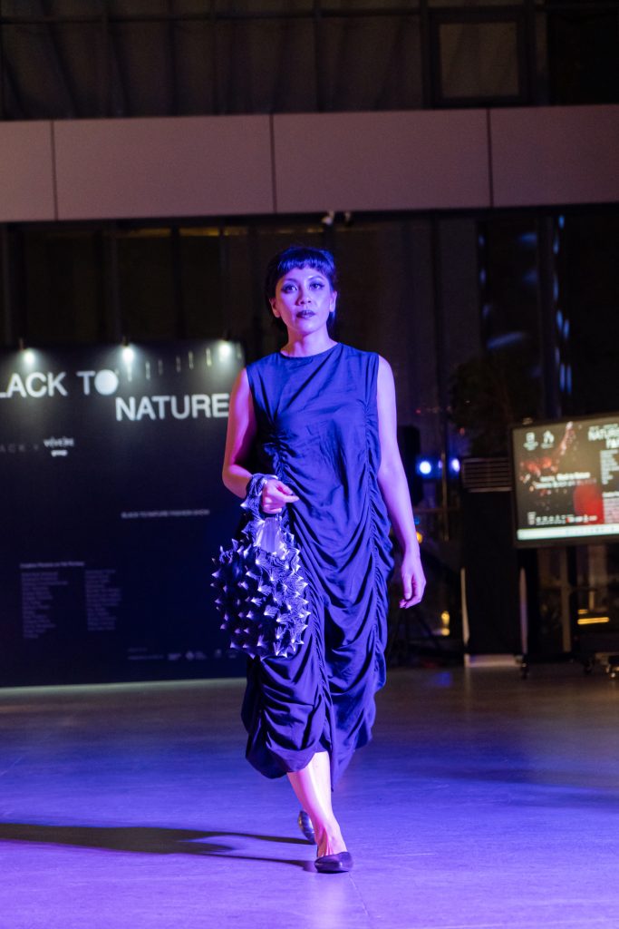 Dalam “Black on Black”, Fuguku mengeksplorasi tekstur, potongan, dan siluet untuk menciptakan kontras halus tanpa warna. Bahan hitam glossy berpadu dengan matte, kulit lembut bertemu tekstil struktur, menghadirkan dimensi yang terasa namun tetap harmonis.