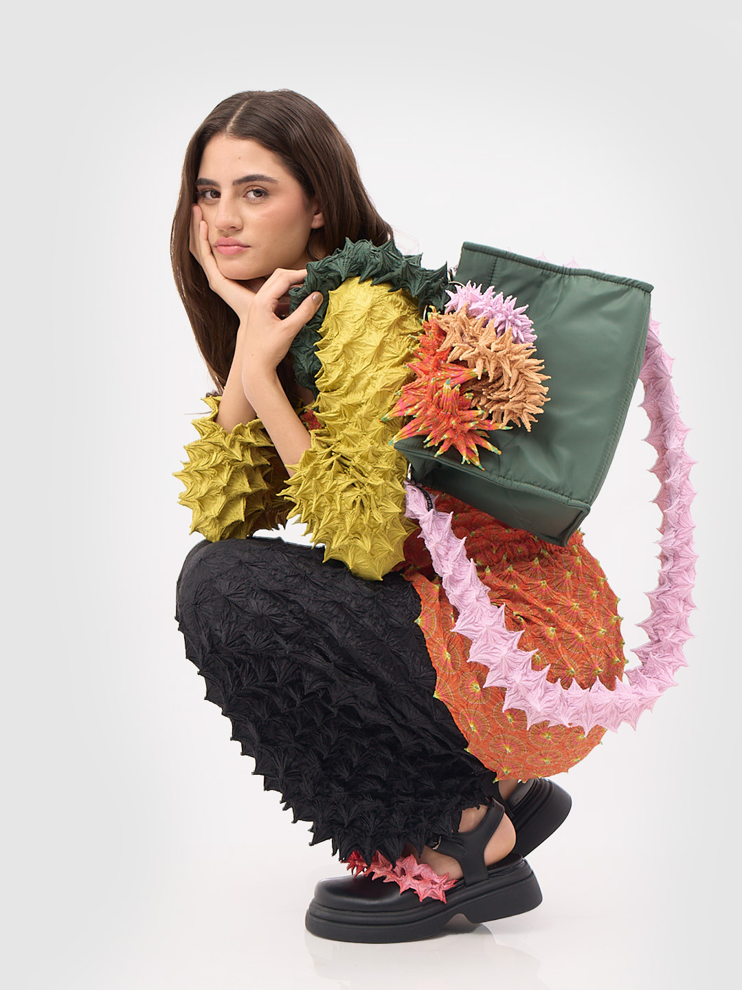 This boxy bag features a striking spiky handle and high functionality, reinforced by a detachable base and internal pockets. Made from recycled plastic fabric, including its signature puffy details, this bag is safe with a magnetic closure.