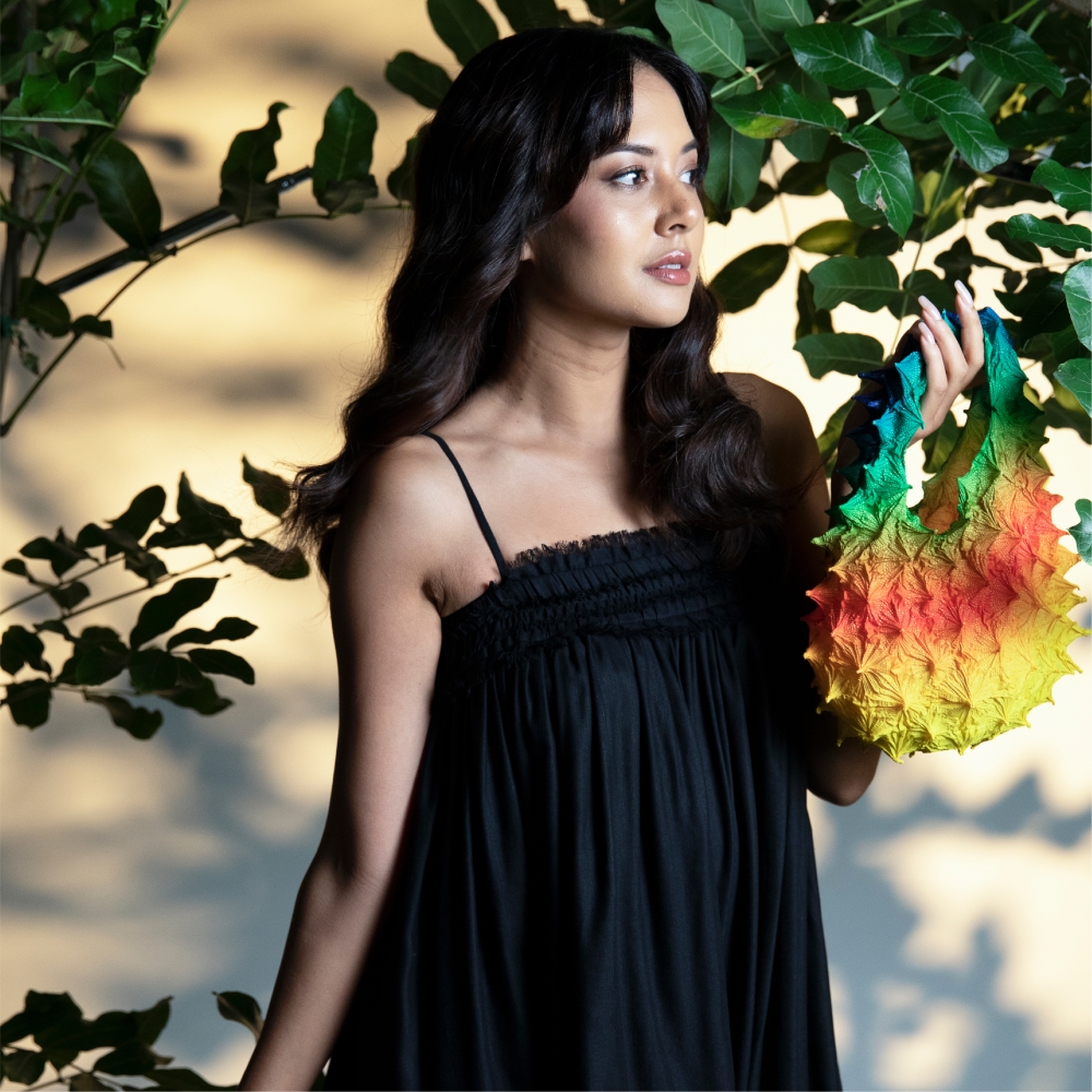Terinspirasi oleh Sun Conure kesayangan Auelie yang bernama Mango, tas ini menampilkan warna-warna cerah yang membuat burung ini begitu istimewa. Bulu Mango yang berwarna kuning, jingga, hijau, biru, dan merah cerah tercermin dalam desain yang unik ini. Ketika ia mengetahui bahwa Sun Conure terancam punah, ia membuat keputusan yang menyentuh hati untuk memberikan Mango rumah di tempat perlindungan burung besar. Kolaborasi ini tidak hanya merayakan keindahan Mango tetapi juga meningkatkan kesadaran tentang konservasi satwa liar.